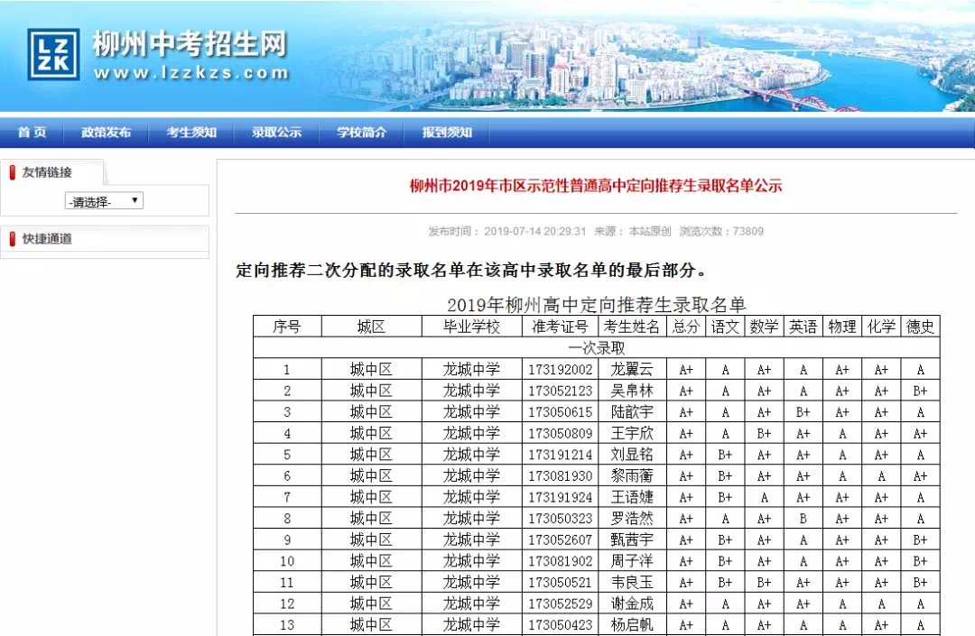 7月14日晚,柳州市2019年市区示范性普通高中定向推荐生录取名单公示。11所高中13个校区,共录取5530人。