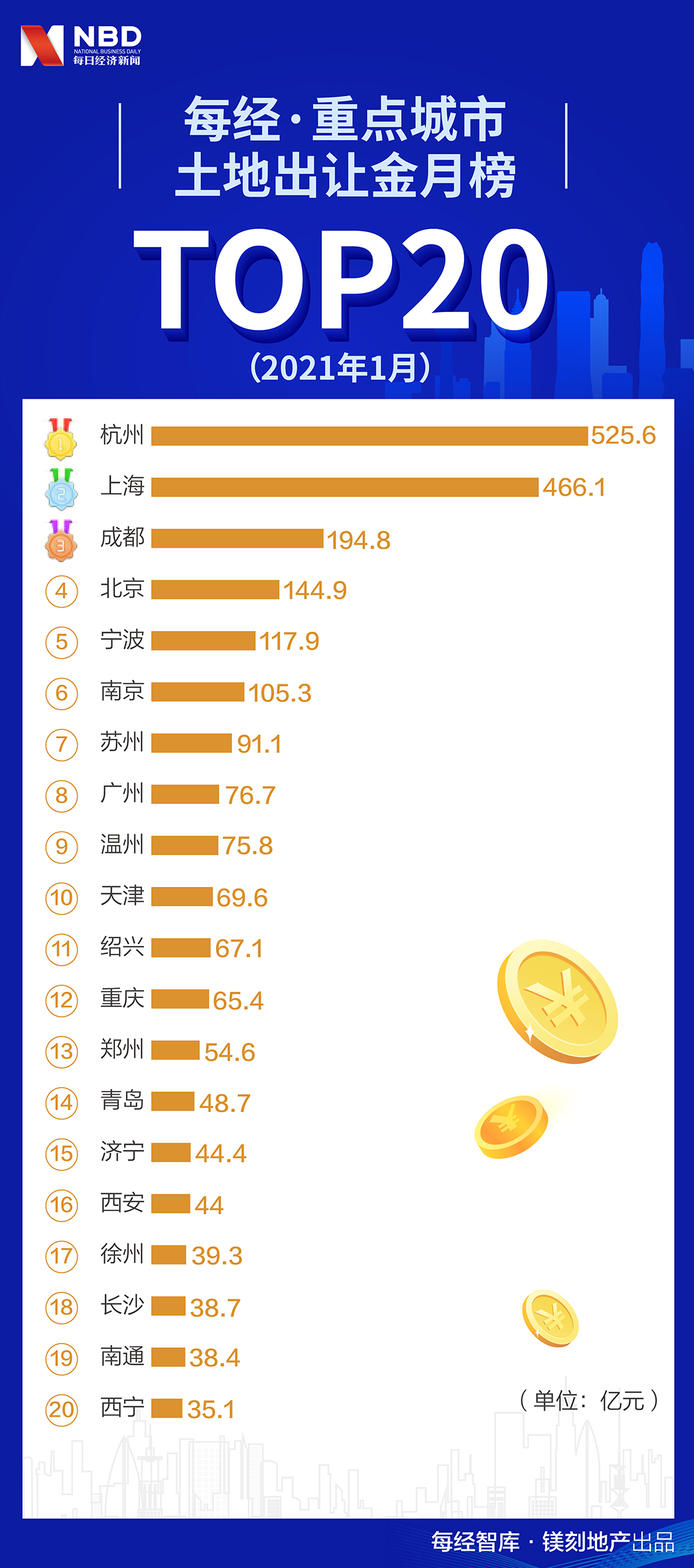 2021年1月上市房企销售金额榜/重点城市土地出让榜