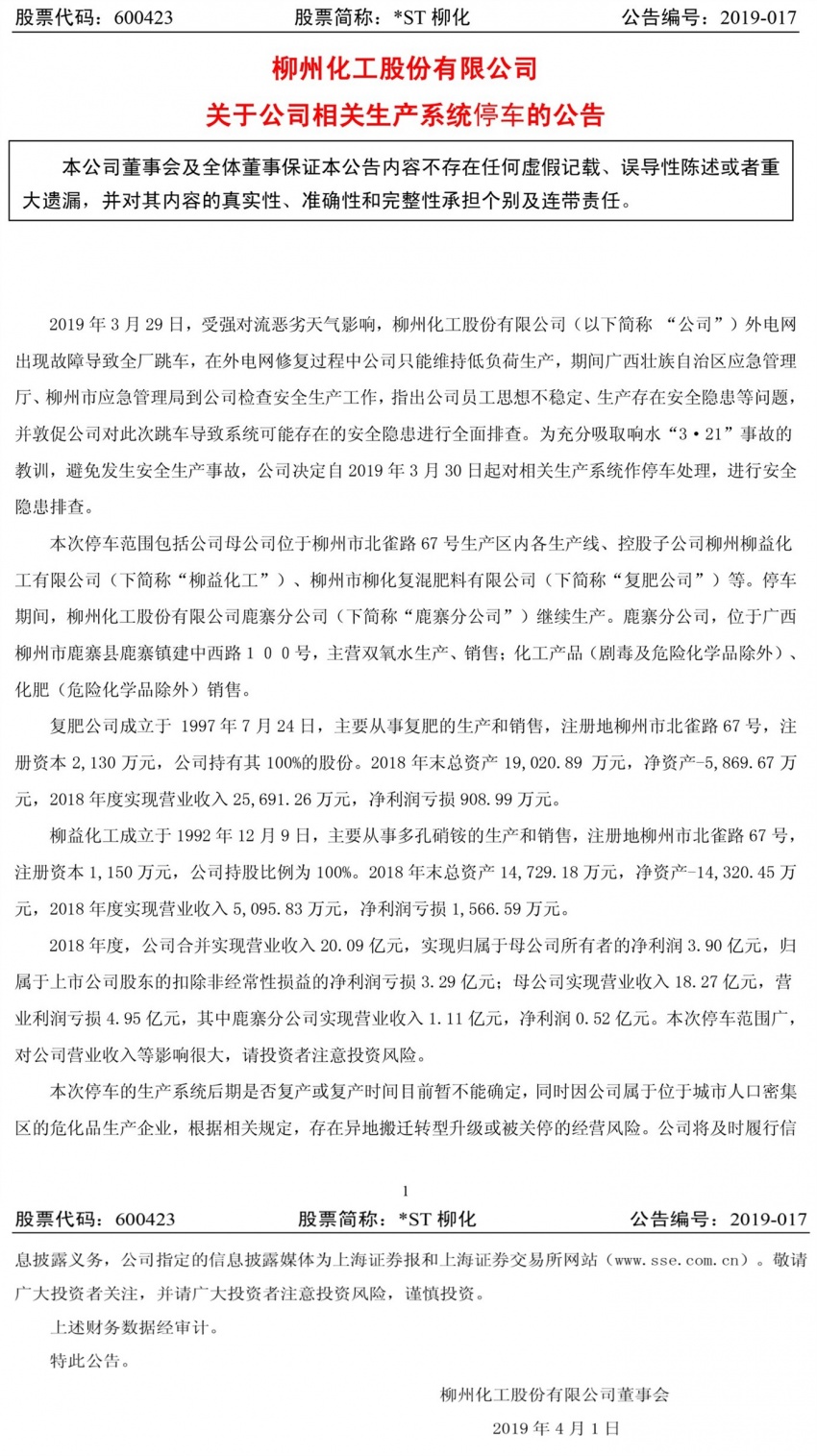 4月1日,柳州化工股份有限公司董事会对外发布了《柳化关于公司相关生产系统停车的公告》,公告称:“为避免发生安全生产事故,决定自2019年3月30日起对相关生产系统作停车处理,进行安全隐患排查。停车范围包括位于柳州市北雀路67号生产区内各生产线、控股子公司等。停车期间,柳州化工股份有限公司鹿寨分公司继续生产。”